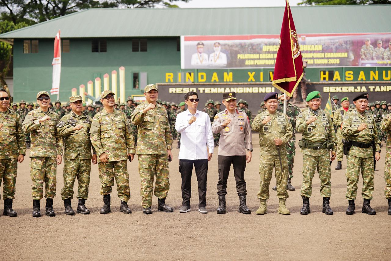 SURYATIMUR.ID.GOWA – Bupati Bantaeng, Muh. Fathul Fauzy Nurdin, menghadiri Upacara Pembukaan Latihan Dasar Militer (Latsamil) Komponen Cadangan (Komcad) Aparatur Sipil Negara (ASN) dan Kepala Desa Provinsi Sulawesi Selatan Tahun 2026. Kegiatan ini juga dihadiri langsung oleh Kepala Badan Cadangan Nasional, Letjen Gabriel Lema, dan Gubernur Sulsel, H. Andi Sudirman Sulaiman di Rindam XIV/Hasanuddin, Desa Mata Allo, Kecamatan Bonto Marannu, Kabupaten Gowa, Pada Senin, 30 Maret 2026.