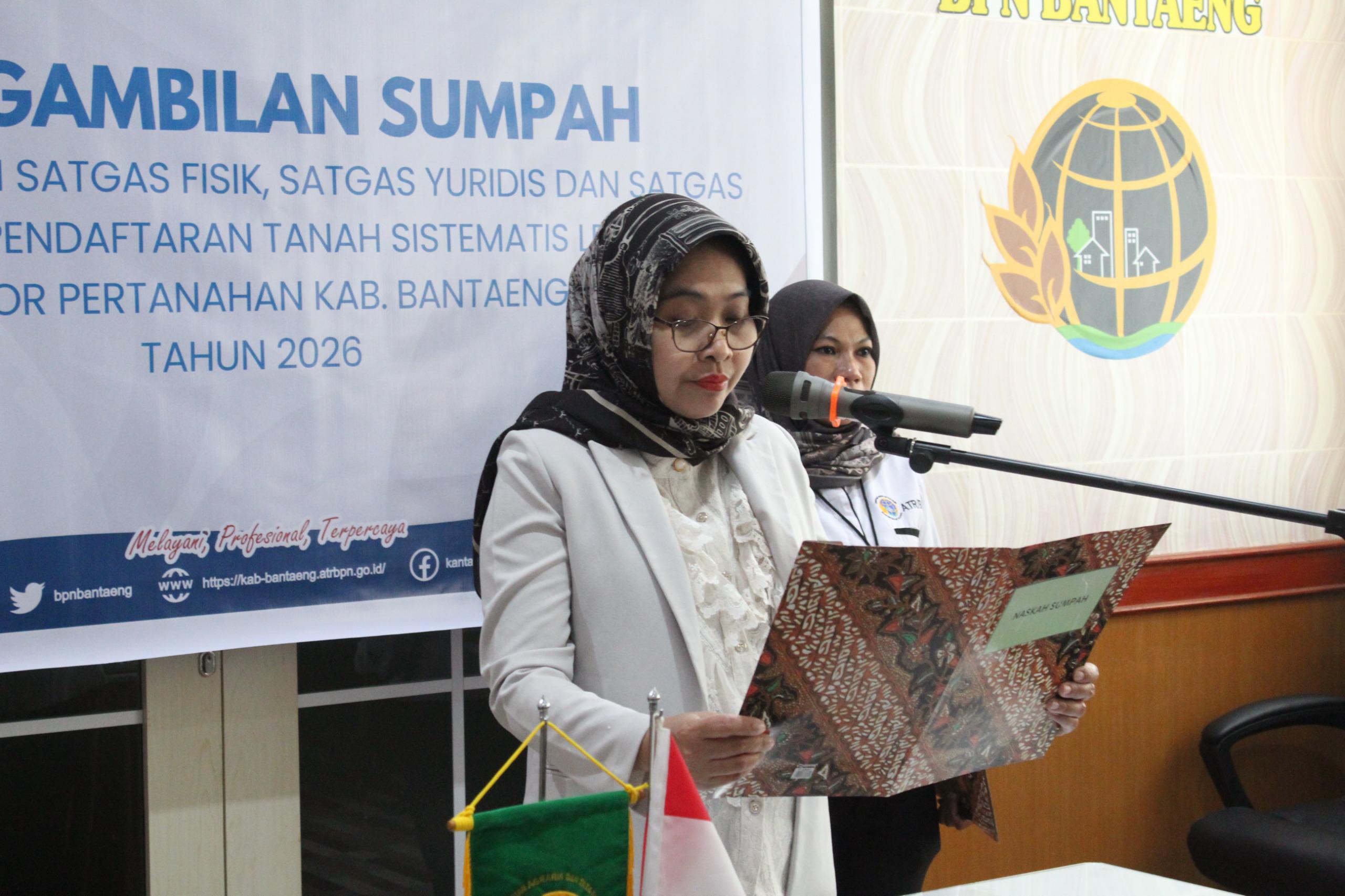 SURYATIMUR.ID.BANTAENG – Kantor Pertanahan Kabupaten Bantaeng melaksanakan kegiatan pengambilan sumpah bagi Panitia Ajudikasi, Satuan Tugas (Satgas) Fisik, Satgas Yuridis, dan Satgas Administrasi dalam rangka pelaksanaan program Pendaftaran Tanah Sistematis Lengkap (PTSL). Kegiatan ini dipimpin langsung oleh Kepala Kantor Pertanahan Kabupaten Bantaeng, Triastuti Listiyaningsih, SE., MM.Rabu, 14 April 2026 Kantor.